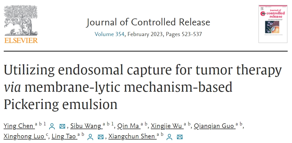 (1)Ying Chen,* , #Sibu Wang,#Qin Ma, Xingjie Wu, Qianqian Guo, Xinghong Luo, Ling Tao,*and Xiangchun Shen.*Utilizing endosomal capture for tumor therapy via membrane-lytic mechanism-based Pickering emulsion.J. Control. Release, 2023,354, 523-537. DOI: 10.1016/j.jconrel.2023.01.035