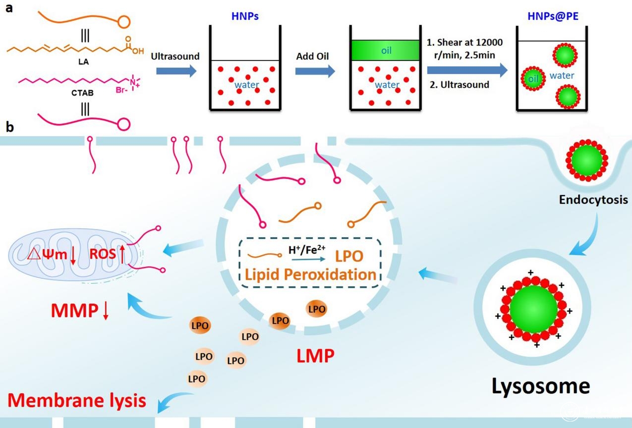 该Pickering乳液是由十六烷基三甲基溴化铵(CTAB)和亚油酸(LA)这两个带相反电荷的分子通过静电相互作用形成的杂化纳米颗粒(HNPs)稳定在油水界面形成的水包油型(O/W)乳液(定义为HNPs@PE)。HNPs@PE通过巨胞饮介导的内吞途径进入溶酶体后,LA在酸性刺激下被质子化,导致HNPs由于静电作用被破坏而肿胀或解体。释放出的CTAB具有很强的膜溶解活性,可以直接破坏溶酶体膜。在酸性条件和溶酶体中过量铁离子(II)的参与下,LA诱导脂质过氧化,产生的脂质过氧化物(LPO)将氧化溶酶体膜,共同导致溶酶体膜的泄漏和内容物释放到细胞质中。随后,扩散的CTAB和LPO将继续攻击线粒体膜和细胞膜,导致不同类型的肿瘤细胞在体内外因膜损伤而死亡。这种具有溶膜能力的Pickering乳液代表了一种有潜力的自抗癌纳米载体药物递送系统。