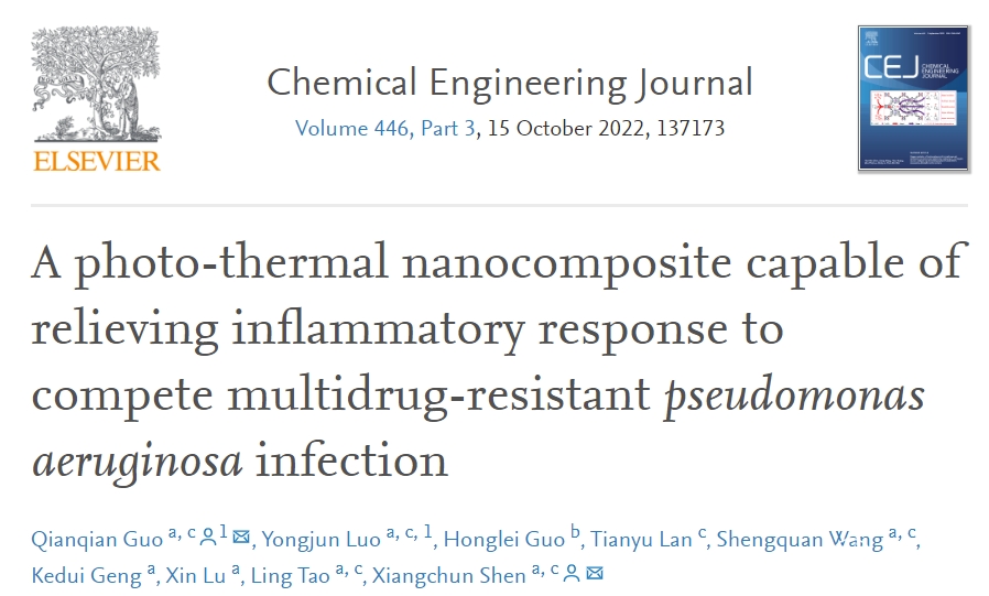 5月31日,3044永利集团郭欠欠副教授、沈祥春教授领衔的团队在国际高水平化学杂志《Chemical Engineering Journal》(中科院分区1区)上发表了题为A Photo-Thermal Nanocomposite Capable of Relieving Inflammatory Response to Compete Multidrug-Resistant Pseudomonas aeruginosa Infection的研究论文,该SCI期刊影响因子为13.27,3044永利集团首次以第一作者单位与第一通讯单位发布。
